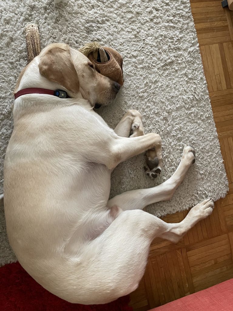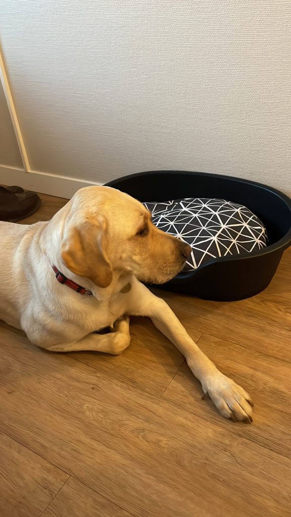 Réveil puis sortie pipi, ensuite repas. Un petit déjeuner pour Patrick après le tour du quartier. Nous sommes ressortis à 14h00 pour un pipi. Après la sieste vers 17h00, nous partons en direction de la pharmacie, nous étions en balade avec juste la chabraque… Les pharmaciennes ont demandé si elles pouvaient me caresser et Patrick a dit oui. Elles savaient qu’au harnais elles avaient pas le droit… Après avoir donné les semainiers et reçu les nouveaux, nous avons continué notre chemin en direction de la Migros, où Patrick a fait des courses… Au moment d’arriver à la caisse il me fait m’asseoir, et me dit de rester… Il avait juste oublié un truc… Il est reparti vitesse grand V avec ses grands pas chercher ce qu’il lui manquait. De retour, je m’étais couché… Donc on attends un moment après quoi Patrick décide de faire du self scanning car à deux caissiers seulement et à 10h40, du monde commence à venir… Après avoir tout scanné et rangé dans un sac… Il paie et nous partons… Chouette je peux continuer à renifler les odeurs dans l’herbe… Patrick remarque que la lampe qu’il avait attaché à la chabraque avait cessé de fonctionner donc il l’a remise à charger…