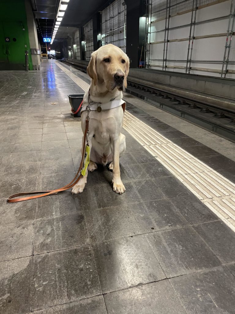 Puis nous sommes sortis au rondeau de Carouge…. Nous avons marché un bout puis Patrick m’a enlevé le harnais pour que je puisse faire un pipi… Puis il a téléphoné à la podologue savoir si elle avait de la place… – Non… Donc on continue jusqu’à M-Parc, là bas il demande à la boutique « Just for you » si ils avaient de la place… Pas non plus donc nous avons fait un tour au m-electronics mais Patrick n’était pas sur de ce qu’il avait dans les mains convenait donc nous sommes partis prendre le 23. Nous montons donc à bord du bus 23 pour la maison… En chemin, nous rencontrons une jeune labrador beige également vidéo :
